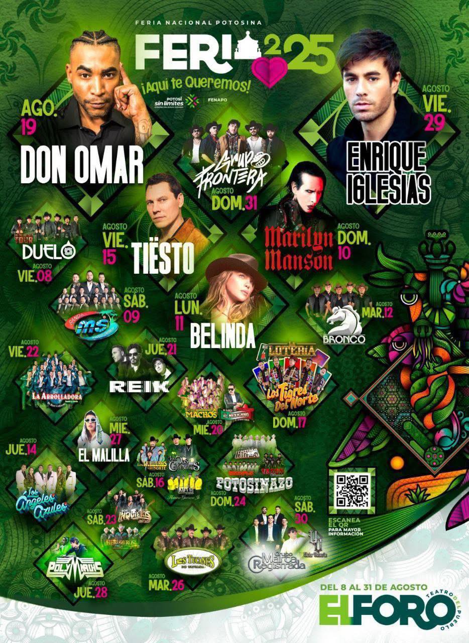 La FENAPO 2025 Feria Nacional Potosina 2025 ya tiene cartelera para su Teatro del Pueblo del 8 al 31 de agosto. Con entrada gratuita y una programación que mezcla lo mejor de la música regional, el pop, el urbano y otros géneros populares, este espacio será el centro musical de la feria, con miles de asistentes cada noche.